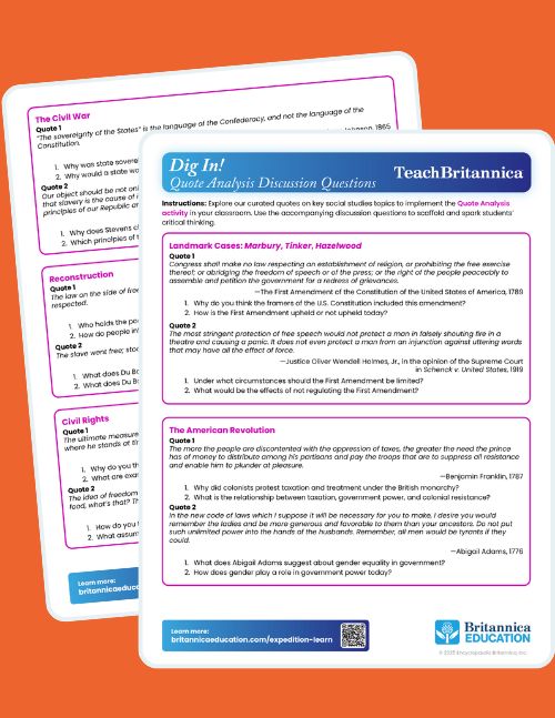 Teach Britannica’s Quote Analysis activity helps you weave these skills into your social studies routine. With regular use, students can become more confident in drawing meaning and identifying multiple perspectives. They will purposefully engage with rich content while strengthening the literacy and social studies skills essential for academic success and navigating the world.