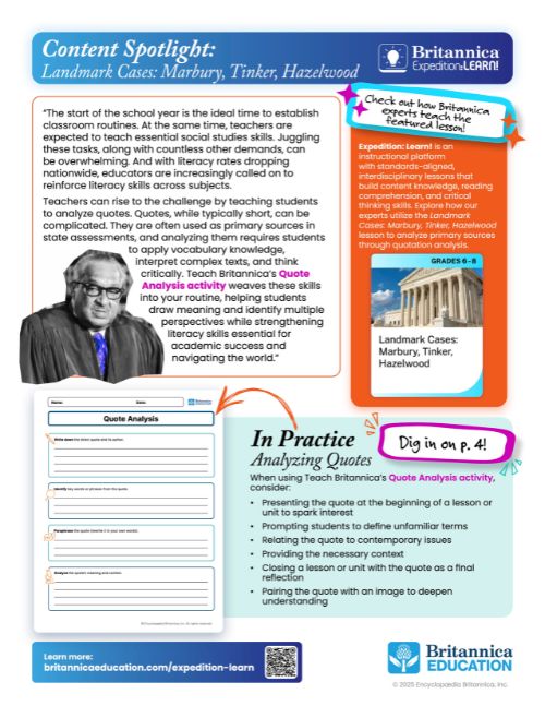 That’s where Britannica Expedition: Learn! comes in; ease into building literacy and social studies skills using our newest content spotlight, all about teaching students to analyze quotes. Quotes, while typically short, can be complicated. Analyzing quotes requires repeated practice and consistent application across various social studies topics. Explore how our experts use quotation analysis to kick off the Landmark Cases: Marbury, Tinker, Hazelwood lesson.