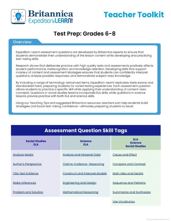 Our Test Prep Guide—available in the Expedition: Learn! Content Spotlight—offers classroom-ready strategies for middle school educators. The guide includes teaching tips, skill-building activities, and targeted resources designed to strengthen instruction and boost student performance in ELA, science, and social studies assessments.