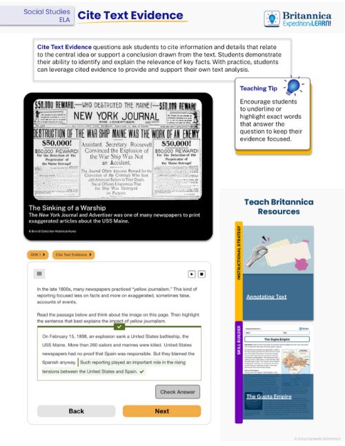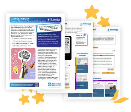 At Britannica Education, our middle school test preparation approach focuses on helping students clearly demonstrate what they know. We combine standards-aligned lessons, high-quality informational texts, and targeted practice with technology-enhanced items, including drag-and-drop, matching, fill-in-the-blank, and more.