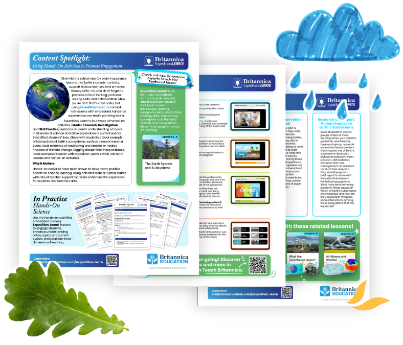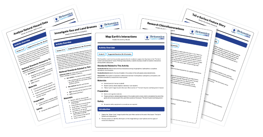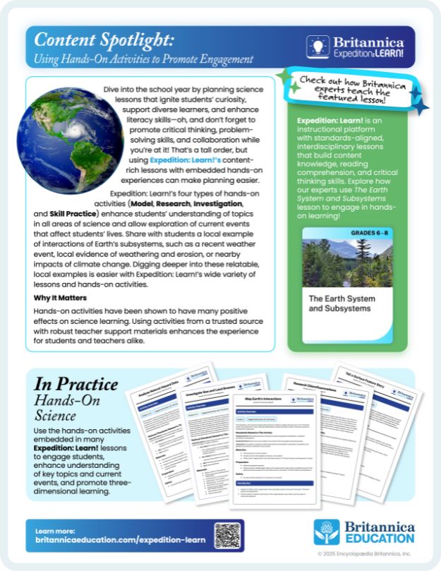 That’s a tall order, but using Britannica Expedition: Learn!’s content-rich lessons with embedded hands-on experiences can make planning easier. Expedition: Learn!’s four types of hands-on activities enhance students’ understanding of topics in all areas of science, allowing them to explore events and processes that affect their lives. Explore how our experts use The Earth System and Subsystems lesson to engage in hands-on learning—just in time for back to school!