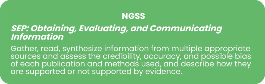 Evaluating information is a foundational skill in science—one that builds critical thinking and deep understanding. With Expedition: Learn!, you can walk students through the process of assessing the credibility of information. The result? Informed students who are empowered to gather information, evaluate credibility, and synthesize information to form a conclusion supported by evidence.