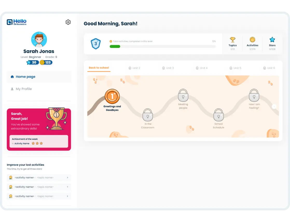 Designed for multilingual learners, Hello Britannica ensures equitable access with bilingual support, mobile usability, offline functionality, and a levelling test that assesses student proficiency before they begin.